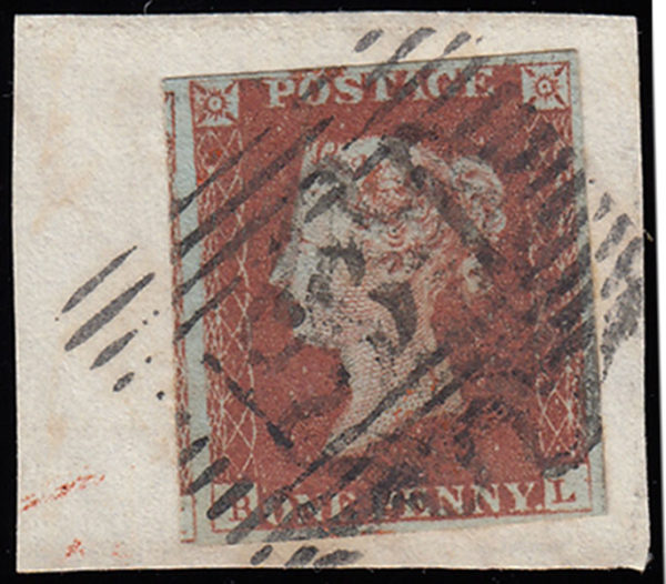 SG8 1844/ 45 1d. Red-brown, plate 53, RL, on small piece. Cancelled with a black mc and Scottish numeral (probably Edinburgh).