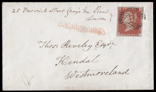 SG8 1846 1d. Red-brown, plate 62, BL, used on a neat cover to Kendal.