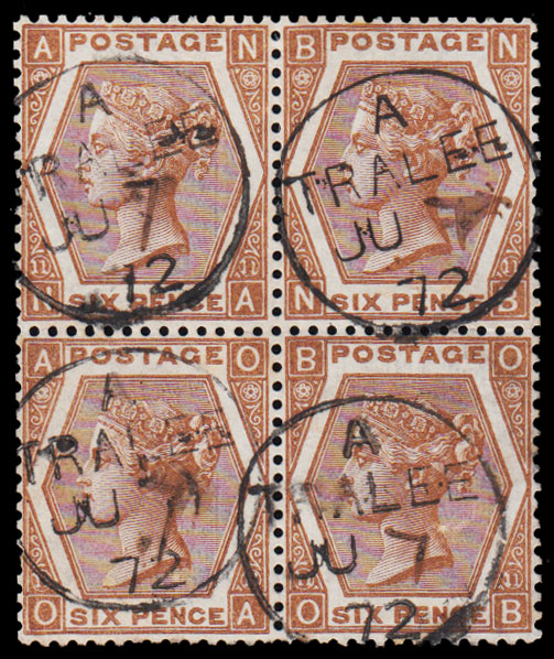 SG122 1872 6d. Deep chestnut, plate 11, NA-OB block of four, Tralee cds’s for JU.7.1872 – “7” inserted by hand.