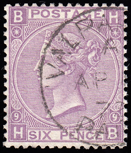 SG104 1867 6d. Lilac plate 6, AF, double perfs at top – usual “A” row misalignment. Very fine used.