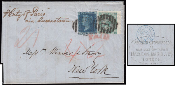 SG101 1866 1/- Green, plate 4, GD. Plus 2d. blue, plate 9, KD, on entire from London to New York, per “City of Paris” via Queenstown.