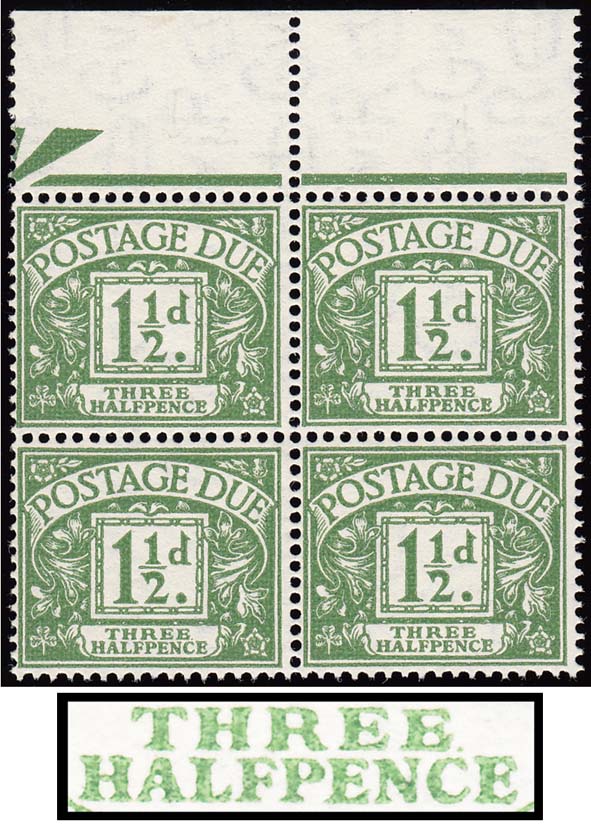 SGD37 1952 1½d. Green. Wmk GVIR. Stop after “THREE” in top right stamp. Superb unmounted o.g block of four.
