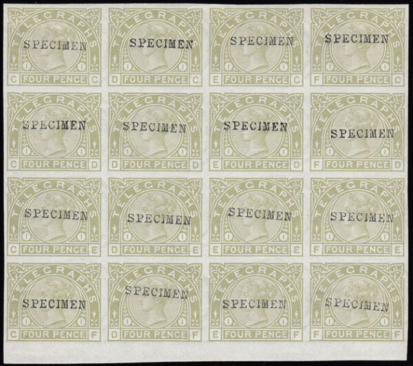 SGL211 1877 4d. Sage green, plate 1, CC – FF. Superb original gum block of 16. Specimen type 9.