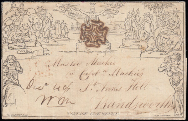 1840 1d. Mulready with a BROWN maltese cross, “Jell’s General & Commercial Envelope” advert within.