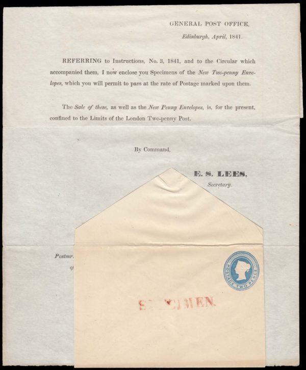 1841 Postal Notice for the 2d. Stationery envelope with silk threads, overprinted with a large, red SPECIMEN.
