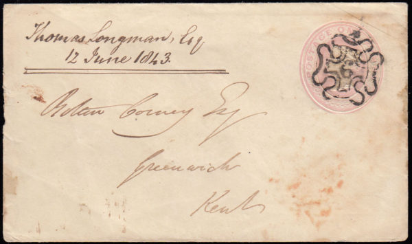 1843 1d. Pink envelope, No.6 in maltese cross to Greenwich, Kent.