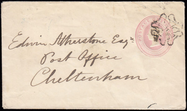 1843 1d. Pink envelope, No.11 in maltese cross to Cheltenham – “Post Office”.