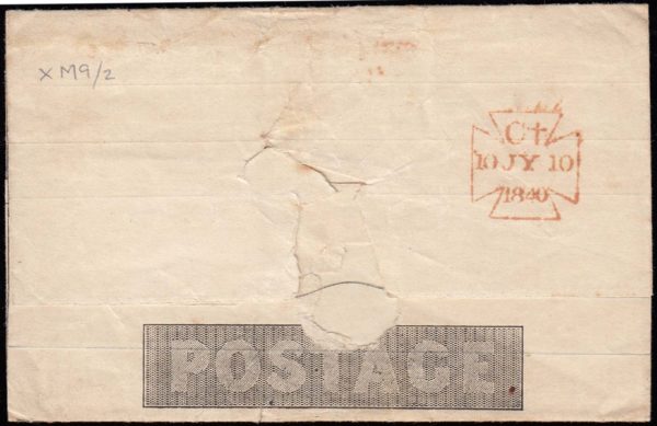1843 1d. Mulready Advert wrapper (Atlas Insurance Co.), neatly folded and sent to Colchester. Superb no. 9 in maltese cross.