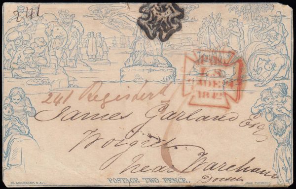 1842 2d. Mulready front addressed to Wareham and sent Registered.