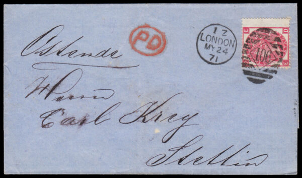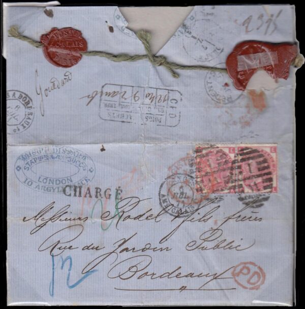 SG102 1871 3d. Rose, plate 6 pair, underpaying postage on Registered cover to France.
