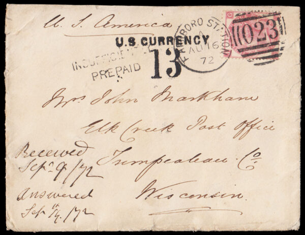 SG102 1872 3d. Deep Rose Pl.8 (GJ). Wmk. Spray. Affixed sideways on envelope sent from FARNBORO STATION to ELK CREEK POST OFFICE, WISCONSIN