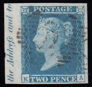 SG14 1841 2d. Blue, plate 3, KA, marginal inscription example.