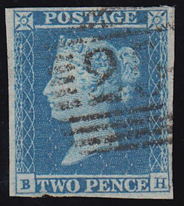 SG14 1842 2d. Blue pl. 3 (LE) State 1 “eyebrow flaw” on London over, black mc and blue “T.P/ Charles St. West” alongside.