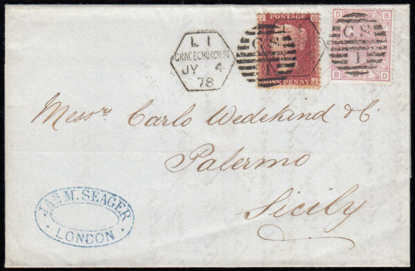 SG141 1876 2½d. Rosy Mauve. Pl.9 (ID).Wmk Orb. Entire sent from London to Sicily, just tied by the ’38’ duplex for 4.OC.78.