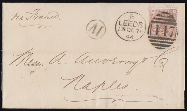 SG141 1876 2½d. Rosy mauve, plate 4, KB, on cover, Leeds to Naples, Italy.
