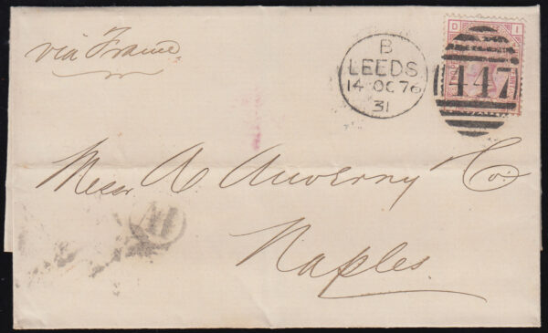 SG141 1876 2½d. Rosy mauve, plate 4, ID, on cover, Leeds to Naples, Italy.