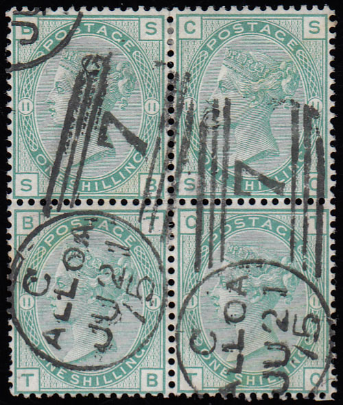 SG148 1873 1/- Green, plate 11 SB-TC, block of four. Neat ALLOA duplex’s.
