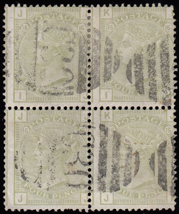 SG153 1877 4d. Sage-green, plate 15, IJ-JK. Rare used block of four.
