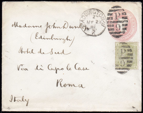 SG153 1881 1d. Pink envelope, uprated with 4d. sage-green, plate 15.