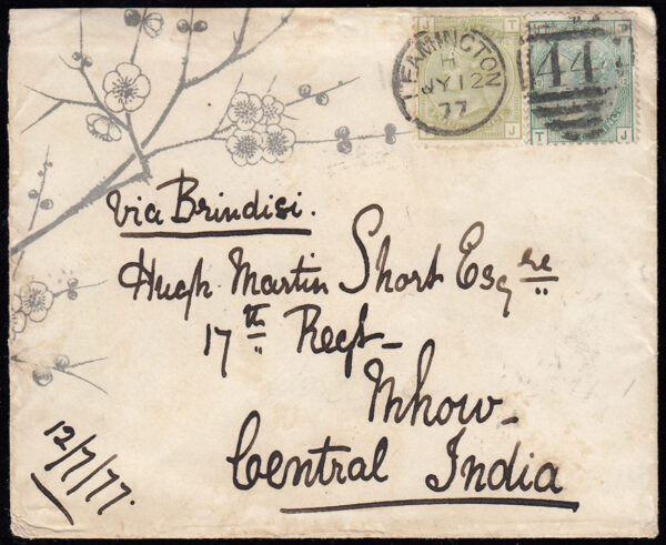SG150 and SG153 1877 Printed (both sides) Cherry Blossom tree envelope, Leamington to Mhow, Central India.