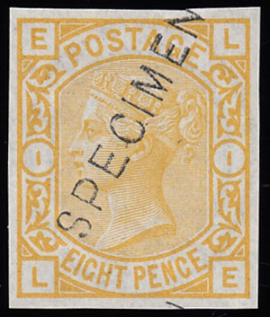 SG156 1876 8d. Brown orange Imperf. Colour trial, diagonally overprinted SPECIMEN Type 11.