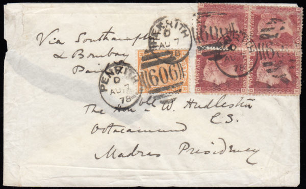 SG156 1878 1d. Rose-red, plate 202 block of 4, DD-EE, plus 8d. on cover, PENRITH to MADRAS, INDIA.