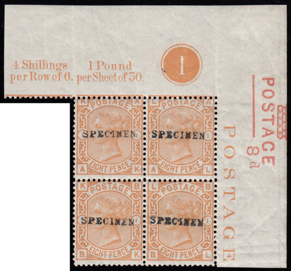 SG156 1876 8d. Orange, F and G columns showing guillotined wing margins.