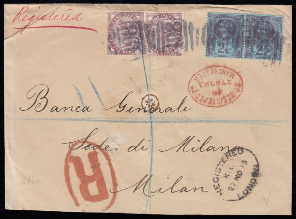 SG172 & SG201 1d. Lilac and 2½d. on Registered envelope, Manchester to Milan, Italy.