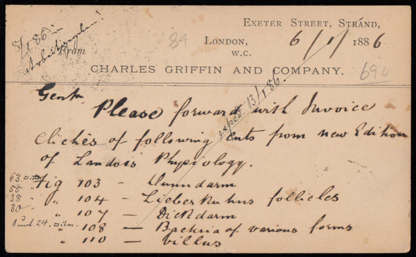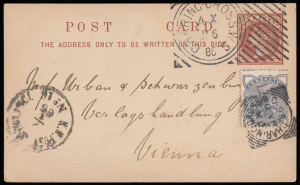 SG187 1886 ½d. Brown post card, uprated with a ½d. Blue with Charing Cross Hoster Machine cancel.