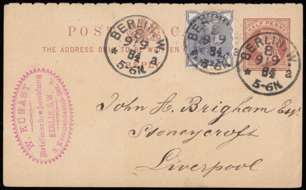 SG187 1884 ½d. Reply paid post card. Sent from Berlin to Liverpool.