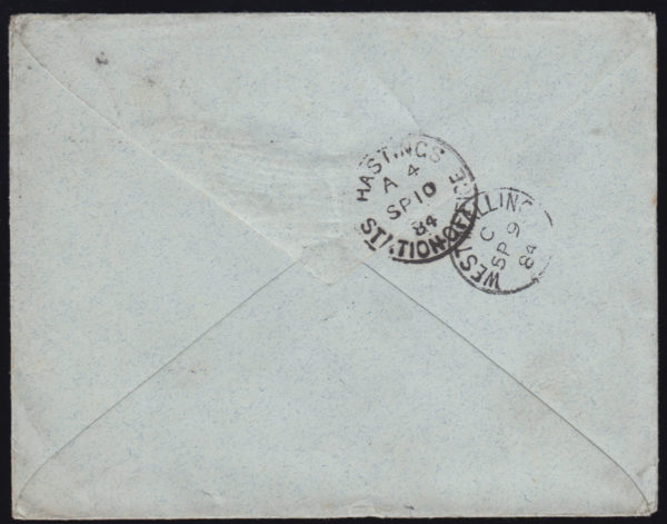 SG187 1884 Railway Station postmarks envelope to Hastings.