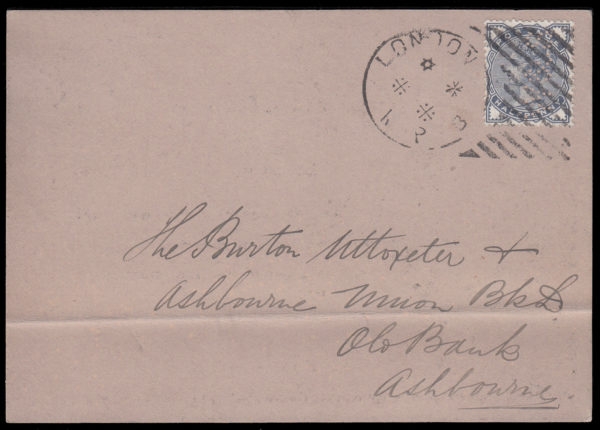 SG187 1884 ½d. Slate-blue. Used on 1d. “Union Postale Universelle” post card.