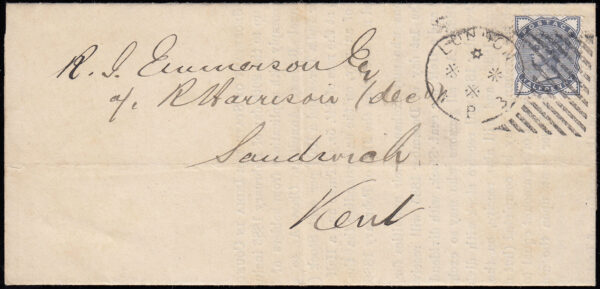 SG187 1884 1/2d. Slate blue, neat dumb cancel London, sent at printed paper rate but sealed and fined 1/2d. Postage Due.