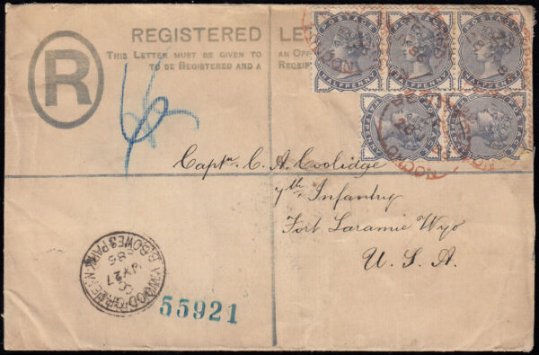 SG187 1885 2d. Stationery registered envelope, London to Fort Laraine, Wyoming, USA.