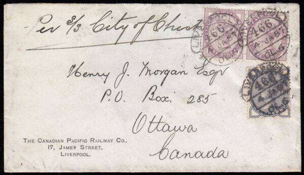 SG187 1887 Liverpool hooded cancel on cover to Ottowa, Canada.