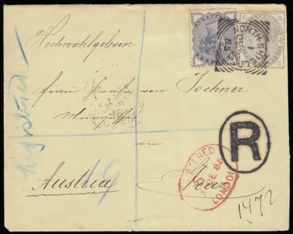 SG187 & SG192 1884 Yellow registered envelope from NORTH SHIELDS to AUSTRIA.