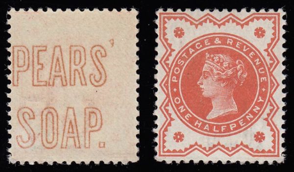 SG197 1887 ½d. Deep Vermilion “Jubilee”. Underprint “PEARS SOAP” in outline letters printed in Blue.