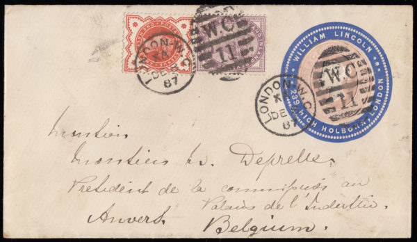 SG172 & SG197 1887 1d. Pink with Blue “William Lincoln” Advertising ring, London to Belgium.