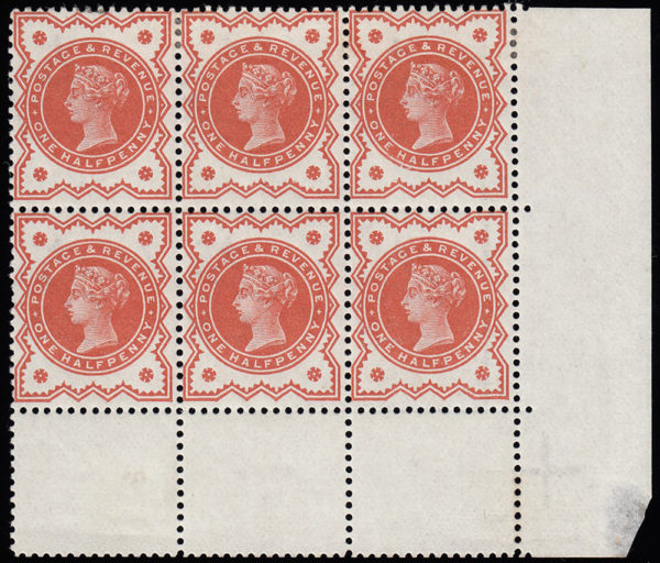 SG197 1887 ½d. Deep vermilion, corner block of 6.