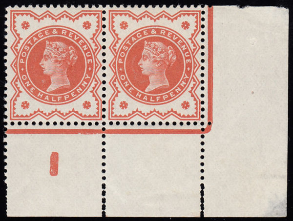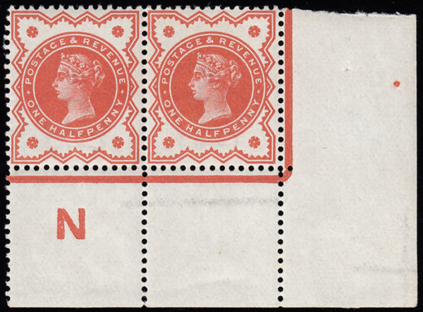 SG197 1887 ½d. Vermilion “Q Control” pair, setting 2(b), perf type P.