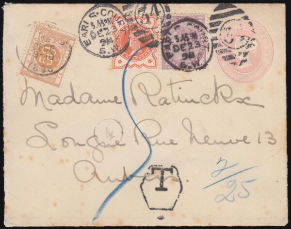 SG172 and SG197 1898 1d. Pink uprated with 1d. lilac and ½d. vermilion, Earls Court to Anvers.