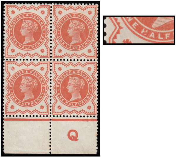 SG197Wi 1887 ½d. Vermilion INVERTED WMK, unmounted o.g Q control block.