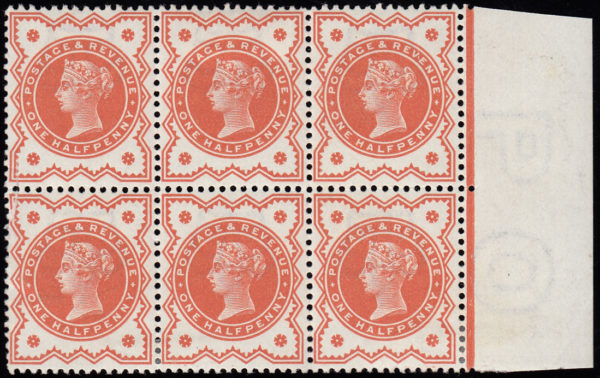 SG197Wi 1887 ½d. Vermilion WATERMARK INVERTED. Superb original gum marginal block of 6