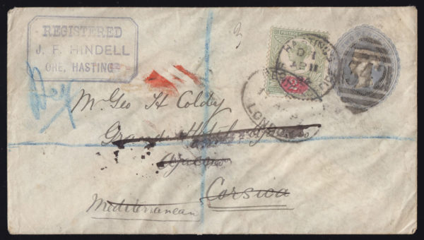 SG200 1897 2½d. Slate-blue stationery envelope, paying Postage plus 2d. paying Registration.