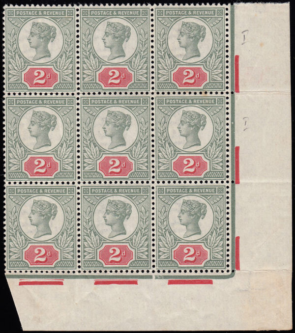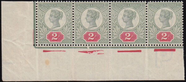 SG200 1887 Jubilee 2d. Damaged line in corner strip of 4. Constant through to Edwardian issue.