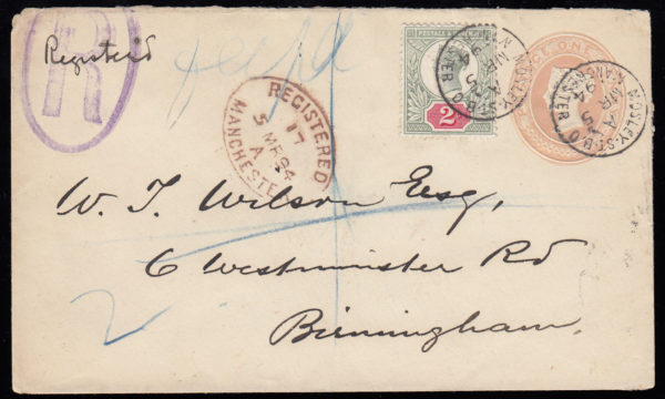 1894 1d. Pink and 2d. Registered post from Mosley, Manchester to Birmingham.