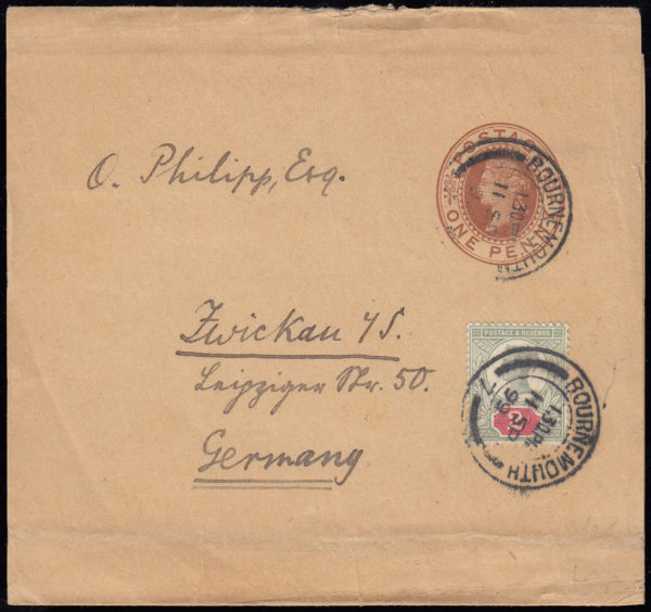 SG200 1887 2d. Grey-green and Carmine “Jubilee”. Used to uprate a ½d. Brown stationery wrapper sent from LONDON to Germany…
