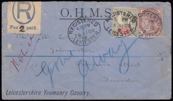 SG200 1900 “O.H.M.S” Registered envelope; Leicestershire Yeomanry Cavalry”
