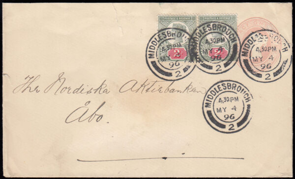 SG200 1896 2d. Jubilee pair on 1d. pink envelope, Middlesbrough to Finland.