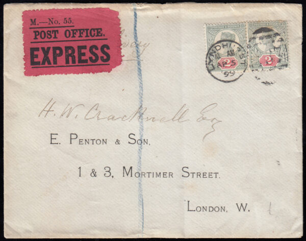 SG200 1899 Express mail, Lyndhurst to London with 2x 2d. Jubilees.